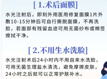(2)手術(shù)后:注射部位在注射后24小時之內(nèi)要保持干燥,避免沾水,不能化妝和暴曬。注射以后需要使用醫(yī)用冷敷貼來鎮(zhèn)靜皮膚,不要用手揉搓肌膚。注射以后注意飲食健康,禁煙禁酒,不吃辛辣食物。注射以后做好防曬工作,避免長時間的戶外暴曬。